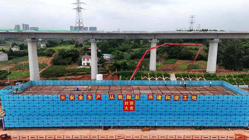 此次封顶的简州牵引变电所位于四川省成都市简阳市石盘新街,建筑面积1340平方米,是成渝中线高铁的核心牵引供电设施之一。