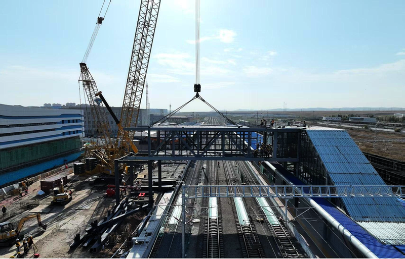 作业现场 10月13日,由内蒙古集通铁路(集团)有限责任公司太锡铁路建设指挥部负责建设、集团公司太锡铁路房建项目部负责施工的太锡铁路锡林浩特站钢结构跨线天桥吊装完成,实现空中精准“合龙”,标志着太锡铁路内蒙古段最大站房改造工程取得关键性突破。