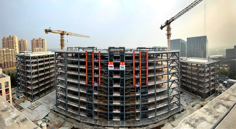 科泰乐讯四期项目位于北京亦庄经济技术开发区,是北京市“3个100”重点工程中的重大科技创新及高精尖产业项目,总建筑面积119133.02平方米,其中地上78657.75平方米,地下40475.27平方米。最大单体研发生产主楼建筑面积32270.44平方米,高50米,单跨跨度9米,涵盖办公、生产用房和配套服务等多元功能。地上5栋单体建筑全部采用钢框架-中心支撑结构,总用钢量约1.1万吨。